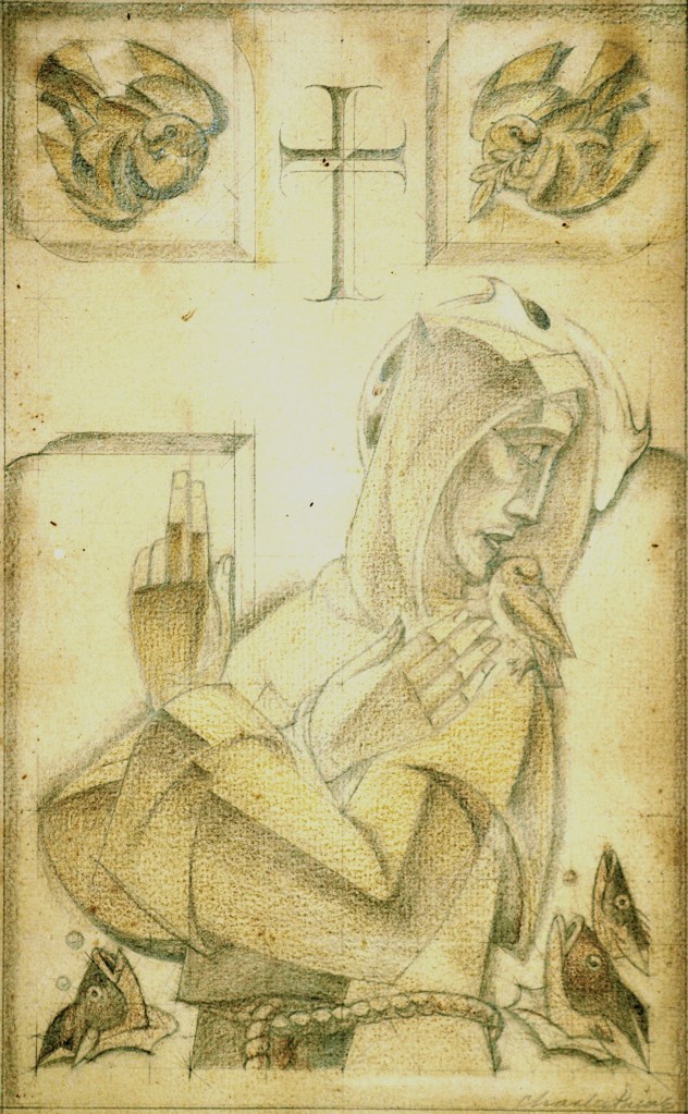 It is a lovely sunny afternoon and I’ve just read your long and friendly letter when you were getting well enough to walk again. I was so glad to hear from you but oh why did you use such a terrible faint pencil so that I could hardly read your letter – even with the aid of a magnifying glass. You – who live in England where they have the finest pencils in the world. I remember you gave me one once that I kept and used until it wasn’t an inch long. Talking of that – I’ve kept everything you ever gave me. Austin was turning out an old chest in my studio looking for some photographs and came across the sketch of a bird. It is in colour chalk – so gay and perfect you expected the little thing to burst into song at once.