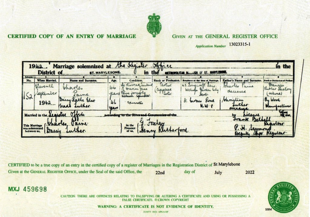 In September 1942 Anna married Paine at Marylebone saying ‘it would help with the rations’. (See marriage certificate below) She refused to change her name. It is not known if Paine had eventually obtained a divorce. Presumably he did as Marian died in January 1962 and he is unlikely to have committed bigamy. (In October 1962 Paine married his third wife, Jane Bolshaw.) They continued to live in Welwyn Garden City.