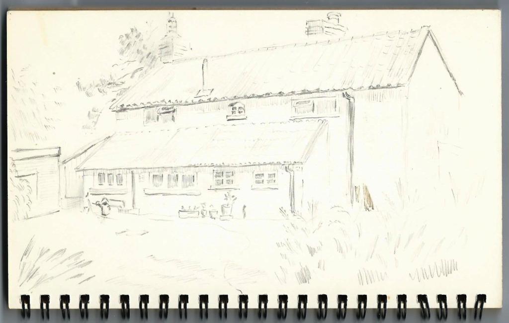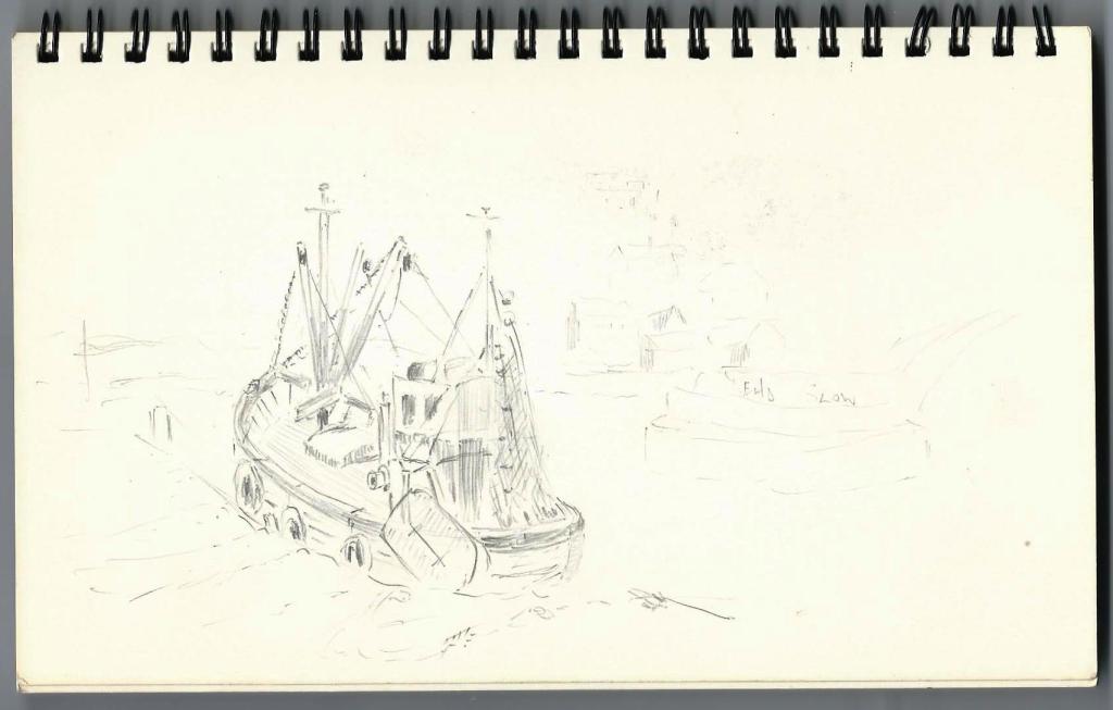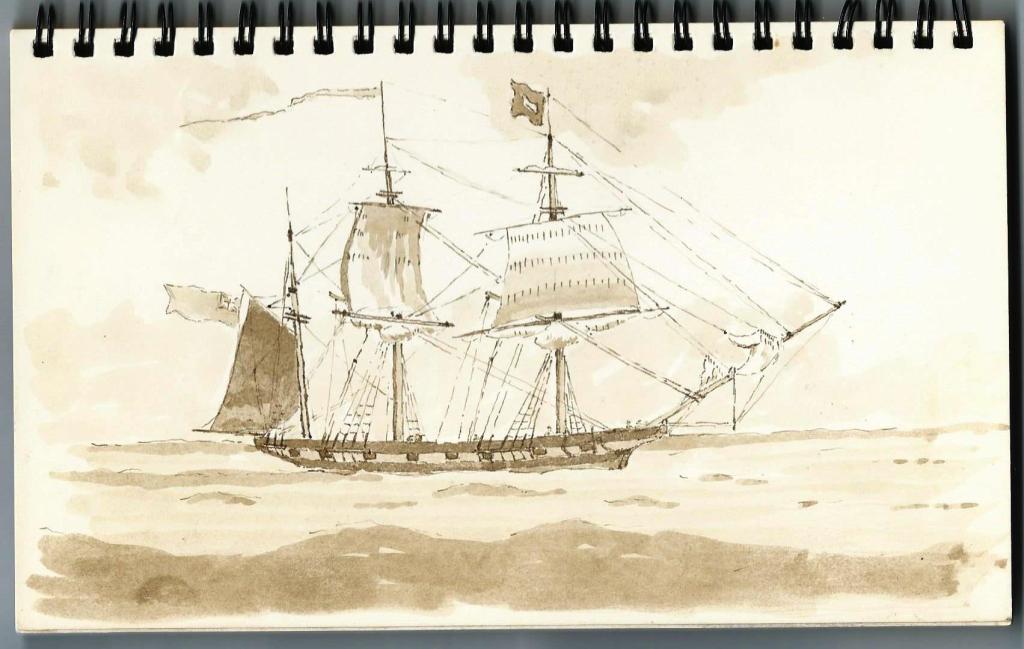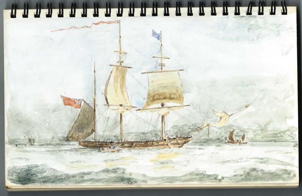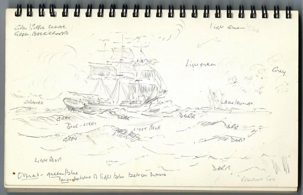 The book contains what appear to be preliminary sketches for a water colour painting of a sailing ship but I have no knowledge of any such finished work.
